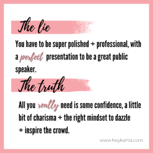Contrary to popular belief, you don’t have to be “super polished” + “super professional” to be an amazing speaker. Expressing your personality, hitting your stride + keeping it real will always be more important.