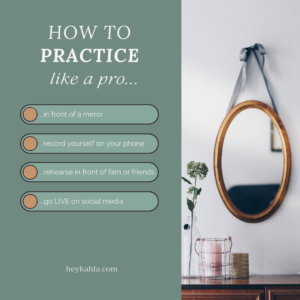 From there, you can record a video of yourself on your phone + watch it back to see if there are any adjustments you’d like to make to the flow of your speech. Just remember that when a lot of people see themselves on camera, they don’t like it + you may find yourself cringing like crazy! So, don’t get discouraged when you watch your video back – how you see yourself isn’t how others view you – they will probably never be as critical as you are to yourself!